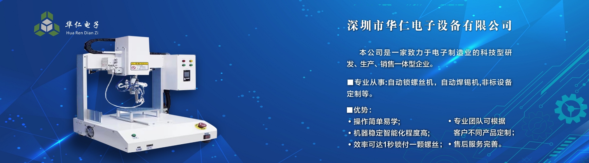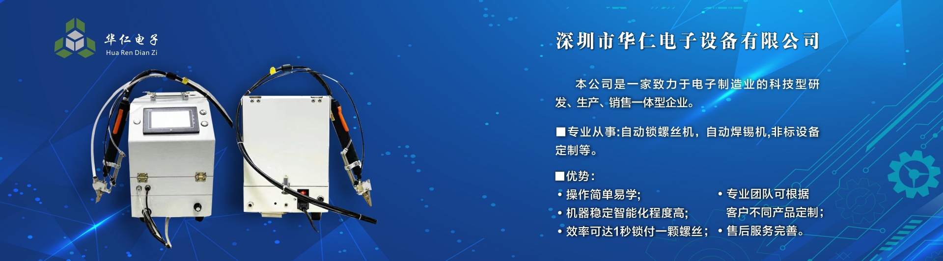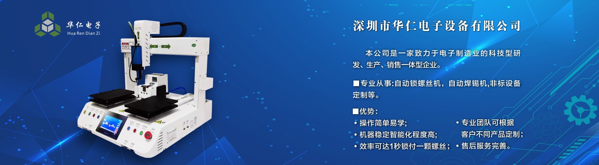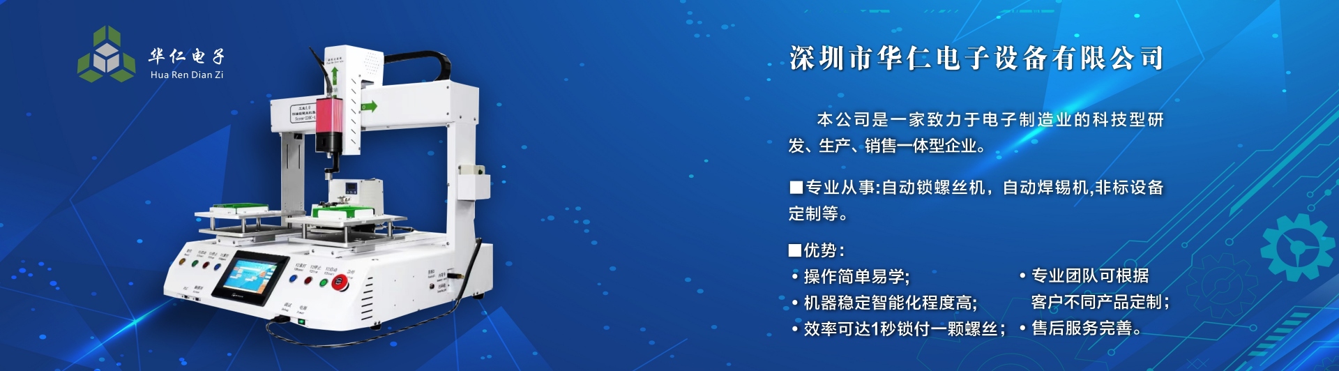 深圳市華仁電子設(shè)備有限公司是一家致力于電子制造業(yè)周邊設(shè)備的科技型研發(fā)、生產(chǎn)、銷(xiāo)售一體的企業(yè),專業(yè)從事:自動(dòng)鎖螺絲機(jī);自動(dòng)焊錫機(jī);非標(biāo)設(shè)備定制機(jī)等,公司長(zhǎng)期以來(lái)在行業(yè)中積累了豐富的經(jīng)驗(yàn),擁有專業(yè)的研發(fā)、技術(shù)、銷(xiāo)售支持工程團(tuán)隊(duì)、各高級(jí)技術(shù)人才為客戶提供優(yōu)質(zhì)產(chǎn)品和服務(wù),同時(shí)不斷吸取國(guó)內(nèi)外先進(jìn)技術(shù),更準(zhǔn)確及時(shí)地為客戶提供優(yōu)質(zhì),性價(jià)比高的產(chǎn)品、公司以專業(yè)的售前、售中、售后服務(wù)贏得了客戶的信賴和好評(píng),為客戶提供先進(jìn)自動(dòng)化設(shè)備一體式解決方案、
